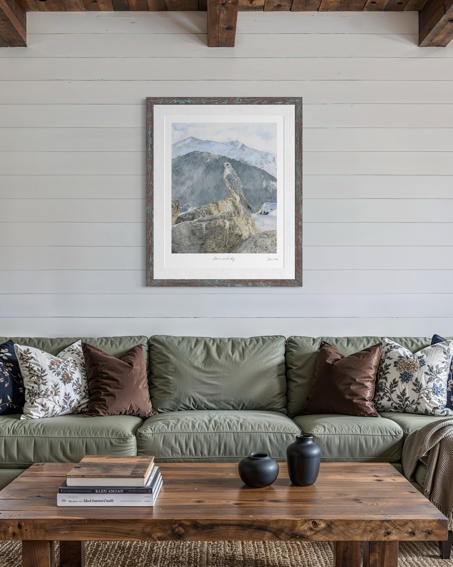 Stone and Sky was created from an original coloured pencil drawing of a gyrfalcon which was commissioned by a collector in the UK